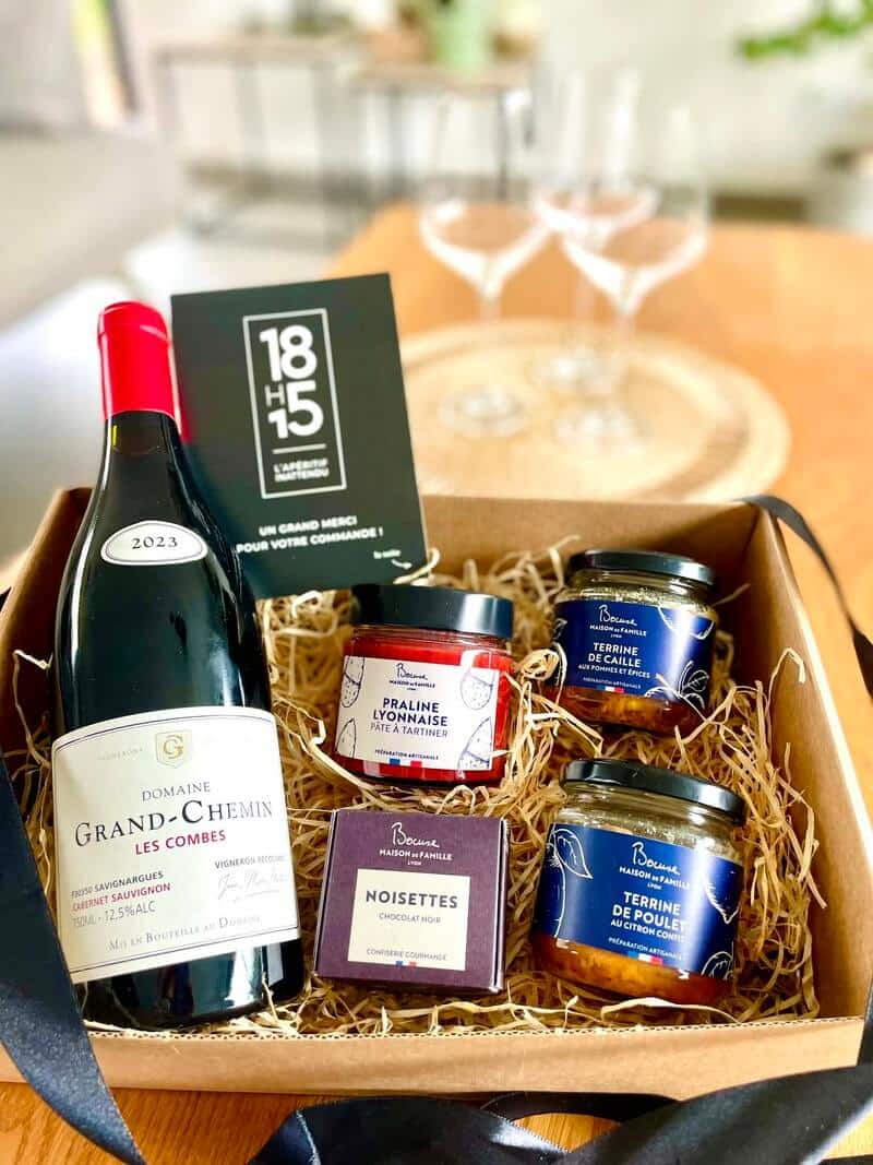 Découvrez 5 produits : 4 produits de la Maison Bocuse (2 salés et 2 sucrés) ainsi qu’une bouteille de vin rouge d’un domaine prestigieux.